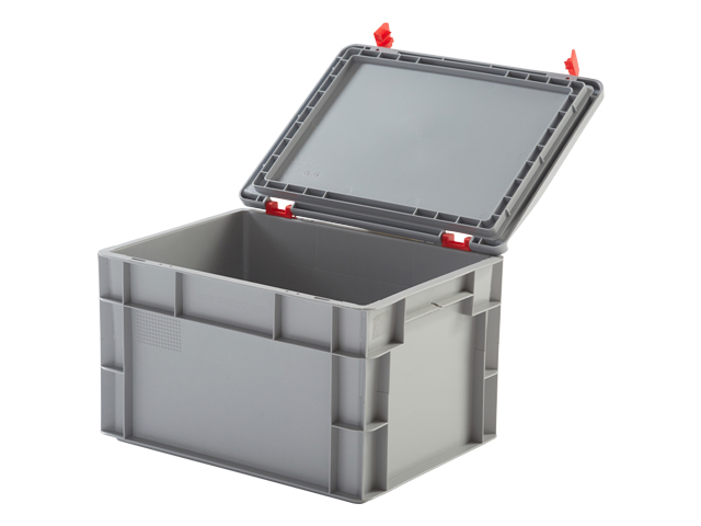 Tapa plástica con 2 clips de cierre y 2 bisagras para cajas EUROBOX 400x300 | Dim.: 400x300x25h mm. | Color: gris
