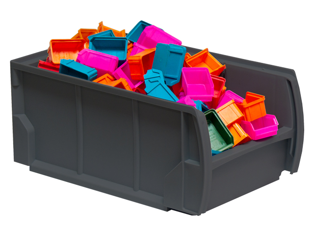 Caja de plástico apilable con abertura frontal PLASTIBOX | Dim.: 335x210x150h mm. | Color: gris oscuro