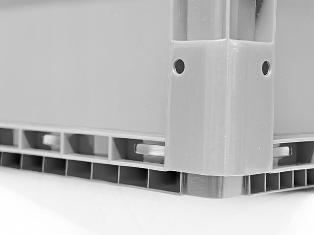 - Base nervada con perímetro liso para una mínima deformación del fondo, fácil acceso en bandas transportadoras. Ideal para sistemas automatizados. Flexión máxima del fondo de la caja de 5 mm. (parámetros válidos para un almacenaje de la carga longitudinal, distribuida uniformemente y una temperatura ambiente constante de 23ºC).